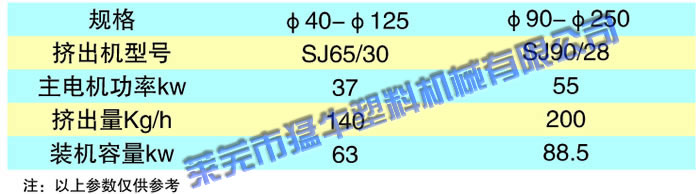 The line is designed for produce HDPE, MDPE and PP plastic pipes with different specifications. By using corresponding screw, die head and pipe caliber setting unit, the extruder can produce ABS, PA and PVC pipes. Features: 1. The extruder is designed with powerful conveying brush and combination high efficiency screw. 2. A separating flow type extrusion die head with central feeding screw. 3. Vacuum negative pressure calibrating and circulating shower cooling. Water temperature, water level and vacuum degree is automatically controlled. 4. Haul off system has a pneumatic clamping unit, the clamping force is adjusted by air pressure value. The haul off speed is automatically displayed. Cutting unit is functioned by hand or automatically. Cutting length can be preset, the capacity is automatically displayed.